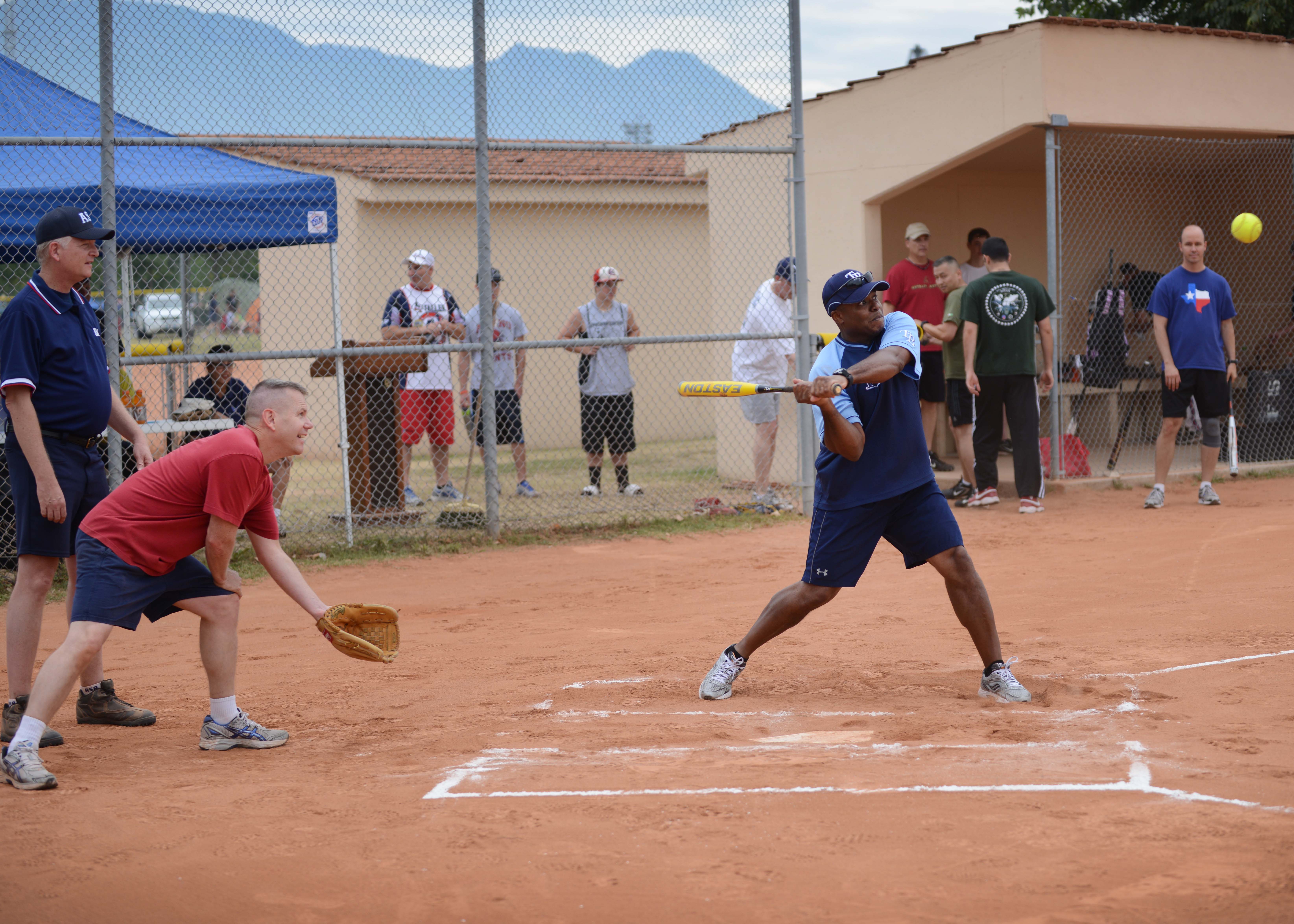 Col. Harry Lane, 31st Mission Support Group commander, swings at a pitch during the Chiefs versus Eagles softball game July 4, 2013, at Aviano Air Base, Italy. The game is a tradition held during base morale events in which chiefs, colonels, squadron commanders and other honorary participants challenge each other in sporting events. The Chiefs dominated the Eagles with a final score of 19-6. (U.S. Air Force photo/Staff Sgt. Evelyn Chavez)