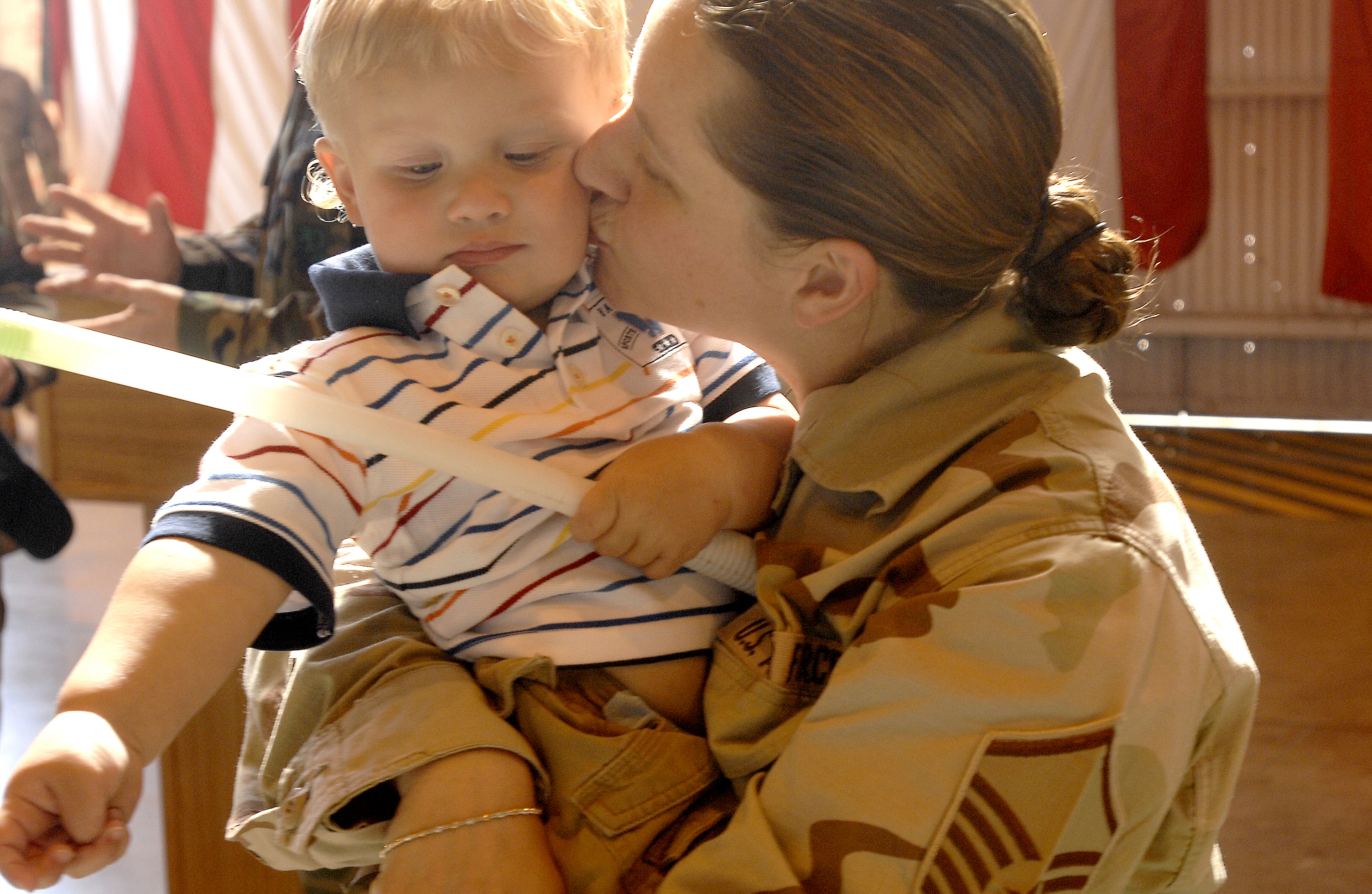Master Sgt. Cristal Bulock, 31st Fighter Wing, reunites with her son after returning from a deployment at Manas Air Base, Kyrgyzstan. Aviano welcomed home Air Expeditionary Force 5 and 6 returnees May 18. (U.S. Air Force photo by Airman 1st Class Liliana Moreno)