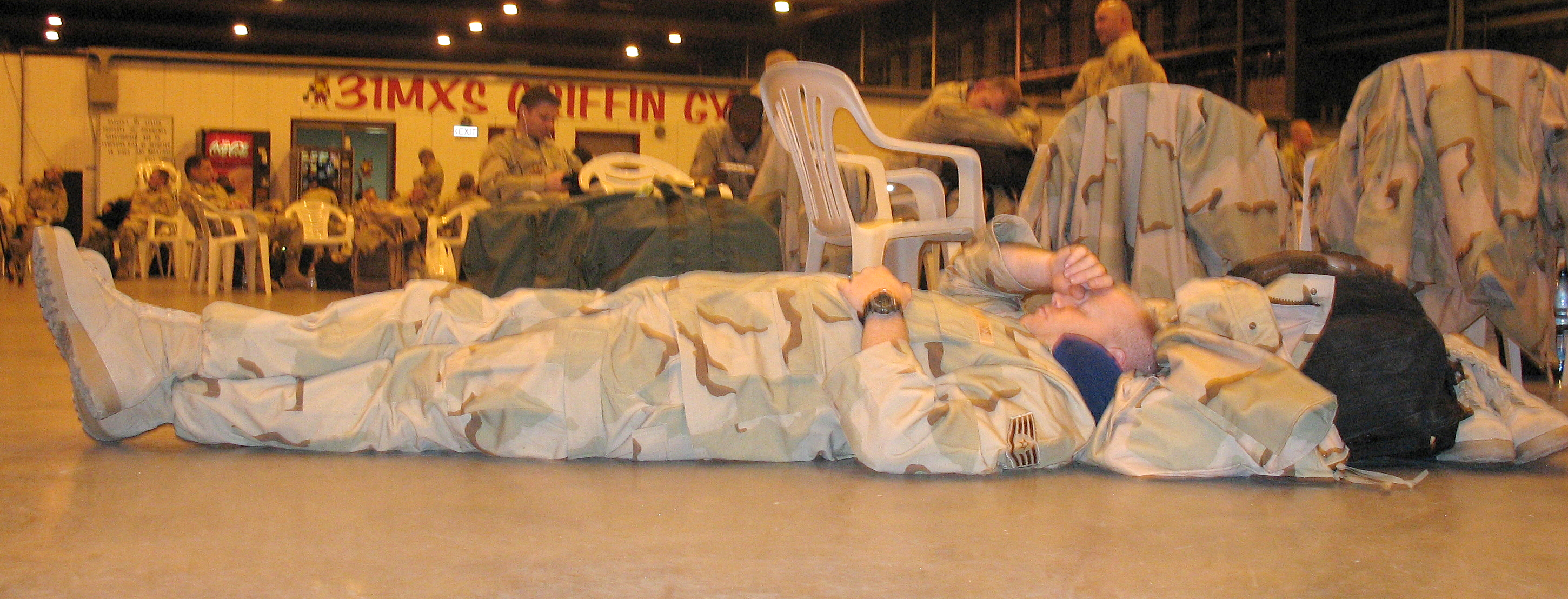 Staff Sgt. James Ward, 15th Civil Engineering Squadron, Hickam Air Force Base, Hawaii, takes a load off at Hangar One Jan. 18 while waiting for transportation to a forward operating location in support of Operation Iraqi Freedom. Sergeant Ward left Hickham Jan. 9 and left Aviano Jan. 20. (Photo by Tech. Sgt. Amy Velasquez)
