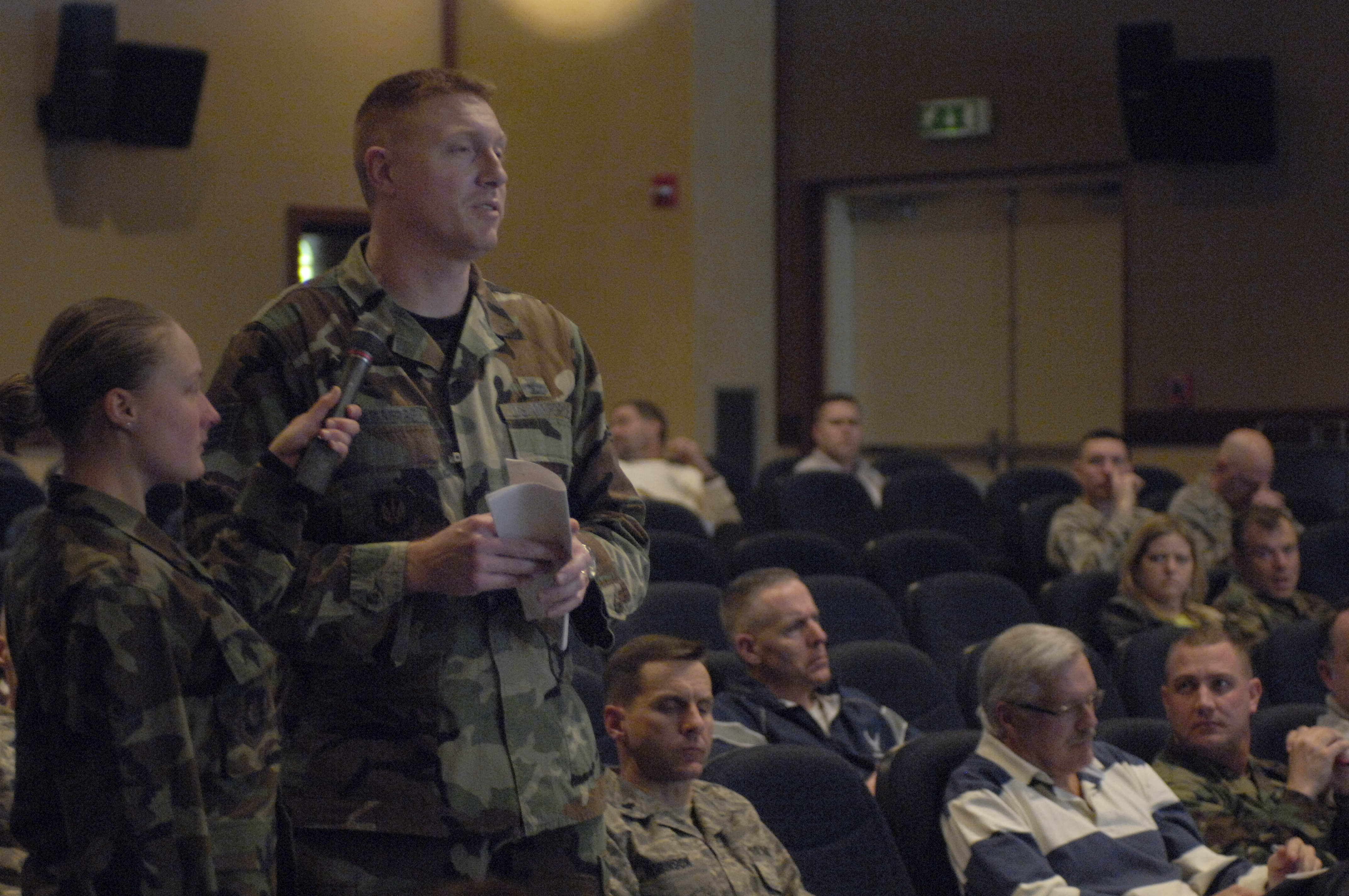 AVIANO AIR BASE, Italy - Tech. Sgt. Geoff Dunkelberger, 31 Security Forces Squadron, asks about possible addition manning for the Child Development Center on Aviano Air Base during the inaugural Town Hall Meeting, Feb. 19, 2008. The Town Hall Meeting allows Aviano Airmen and their families to voice their concerns to the Commander and other senior leadership directly. (U.S. Air Force photo/Senior Airman Michael S. Dorus)