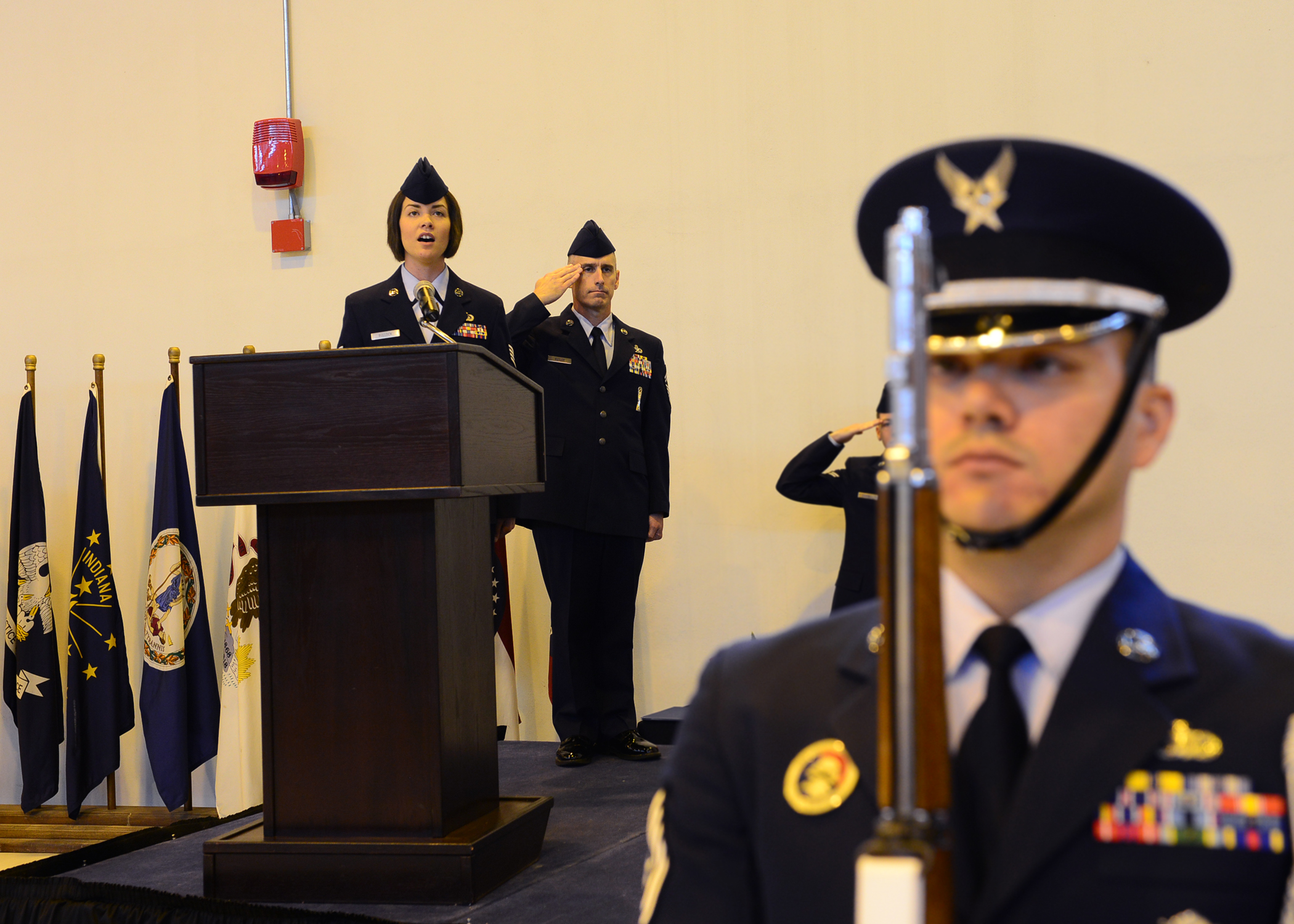 Staff Sgt. Jolene Bullock, 31st Civil Engineer Squadron, sings the “The Star-Spangled Banner” during a change of command ceremony on Aviano Air Base, Italy. For ceremonies and events at Aviano, volunteer Airmen sing both the American and Italian national anthems as a way to pay respects while sharing and participating in what they love – music. (U.S. Air Force photo/Senior Airman Matthew Lotz)