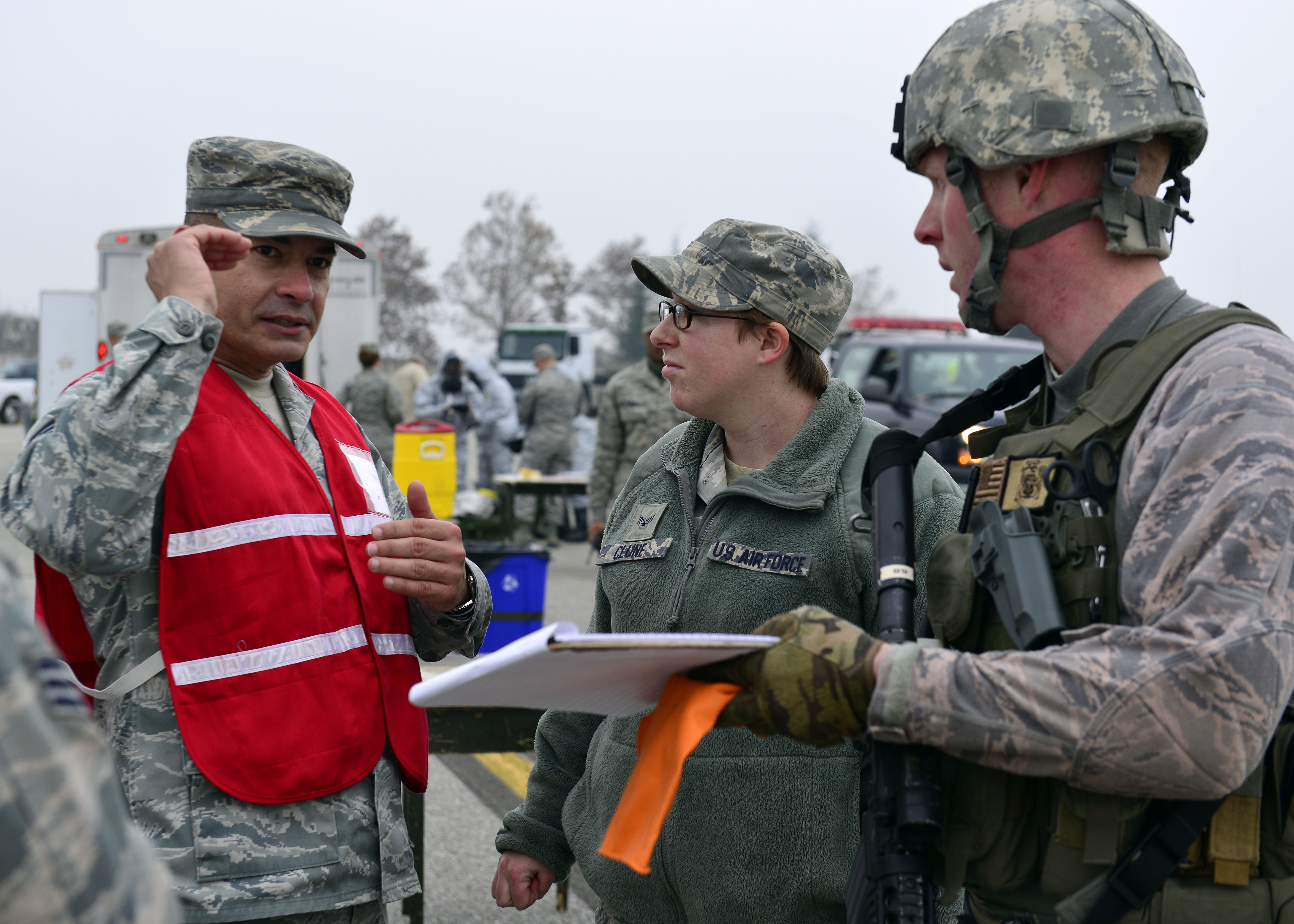The 31st Civil Engineer Squadron emergency management flight partners with other squadrons during a wing inspection, Nov. 17, 2015, at Aviano Air Base, Italy. Wing inspections provide the EM flight with feedback of how prepared the base is during an emergency response. (U.S. Air Force photo by Airman 1st Class Cary Smith/Released)