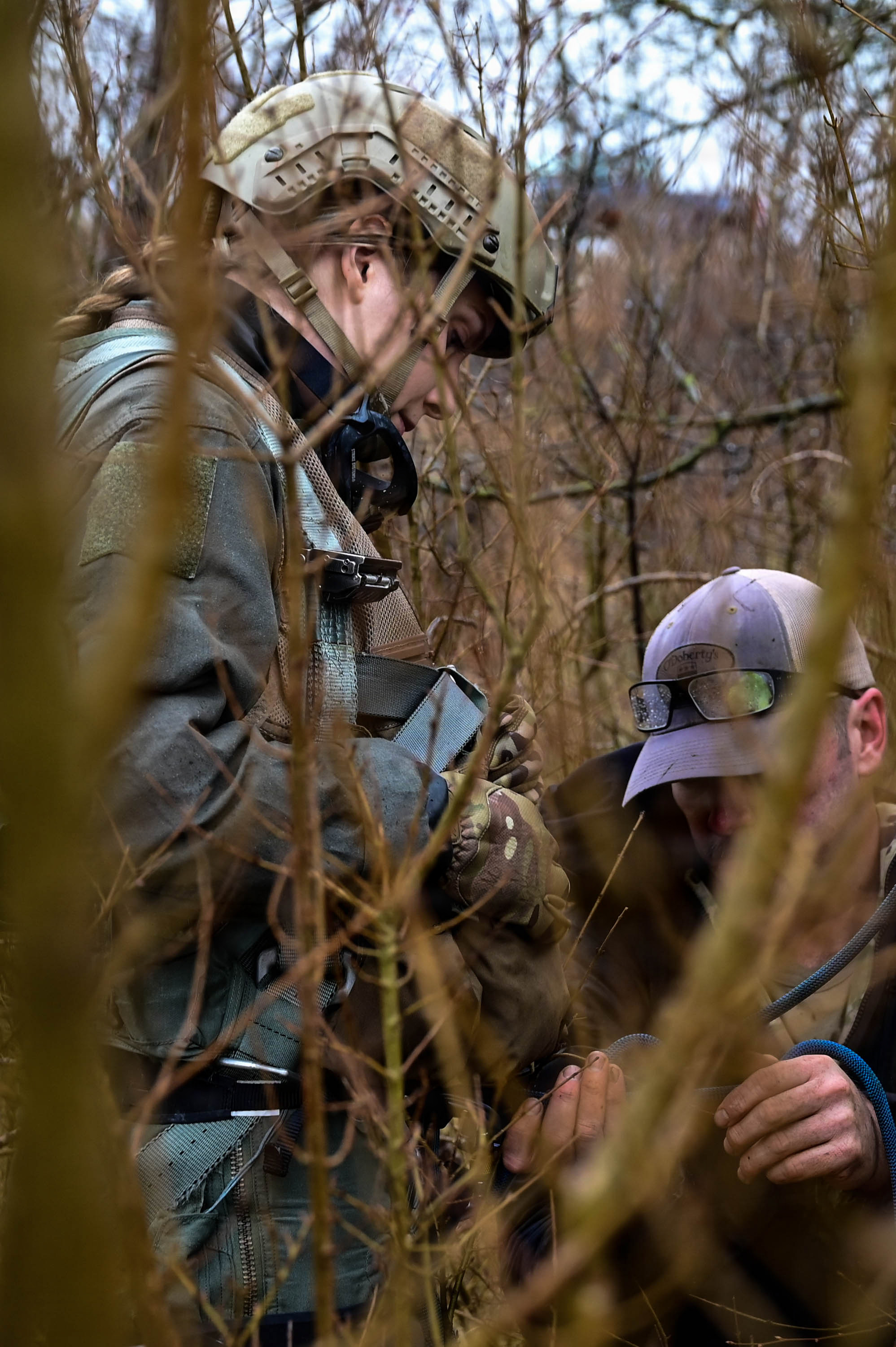 U.S. Air Force TSgt Matthew Jensen, 31st Operations Support Squadron Survival, Evasion, Resistance and Escape specialist, pulls U.S. Air Force Capt Danielle “Devito” Beigelman, 510th Fighter Squadron F-16 pilot, into a tree using a rope system to simulate an aircraft crash during Operations Group War Day, at Aviano Air Force Base, Italy, Feb. 5, 2026. The training scenario, supported by U.S. Air Forces in Europe – Air Forces Africa headquarters, enhanced the 56th and 57th Rescue Squadron’s survival and recovery skills. (U.S. Air Force photo by SrA Tyrique Barquet)