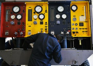 U.S. Air Force Staff Sgt. Jade McGill, 31st Maintenance Squadron aerospace ground equipment journeyman, adjusts a drip pan to fix a hydraulic test stand, Feb. 25, 2015, at Aviano Air Base, Italy. The AGE flight provides heaters, hydrogen, electrical and air pressure support equipment for aircraft