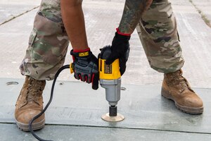 U.S. Air Force Airman assigned to the 31st Civil Engineer Squadron works with members from the Estonian air force during an Expeditionary Airfield Damage Repair Agile Combat Employment exercise at Amari Air Base, Estonia, Aug. 26, 2024. Agile Combat Employment is a key operating concept for how the