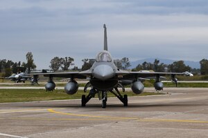 A U.S. Air Force F-16 Fighting Falcon assigned to the 510th Fighter Squadron takes off to support exercise INIOCHOS 21, Aviano Air Base, Italy, April 6, 2021. INIOCHOS 21 is an annual exercise in Greece designed to provide advanced and realistic aircrew training to strengthen interoperability of