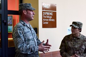 U.S. Air Force Gen. Jeff L. Harrigian, right, U.S. Air Forces in Europe and Air Forces Africa commander, speaks with Chief Master Sgt. Matthew Pipes, middle, 31st Aircraft Maintenance Squadron, 555th Aircraft Maintenance Unit superintendent and Lt. Col. Beau E. Diers, 555th Fighter Squadron