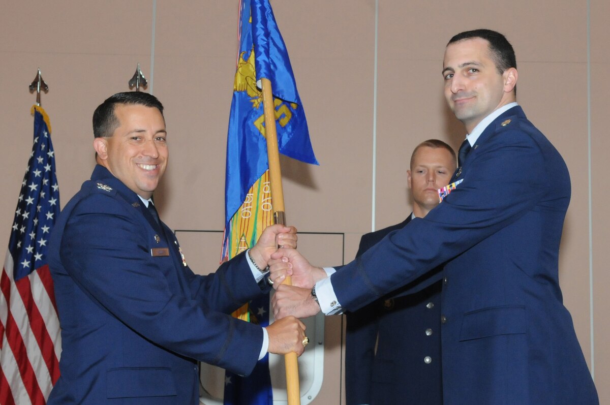 Lt. Col. Thomas P. Angelo receives the flag of the 31st Force Support Squadron from Col. Brian T. Kelly, 31st Mission Support Group commander, during the 31st FSS change of comand ceremony June 25 at the La Bella Vista Club. Colonel Angelo was the deputy division chief for Manpower and Personnel, Headquarters U.S. Air Force, Washington, D.C. (U.S. Air Force photo/Staff Sergeant Mercedeskimble L. Crossland)