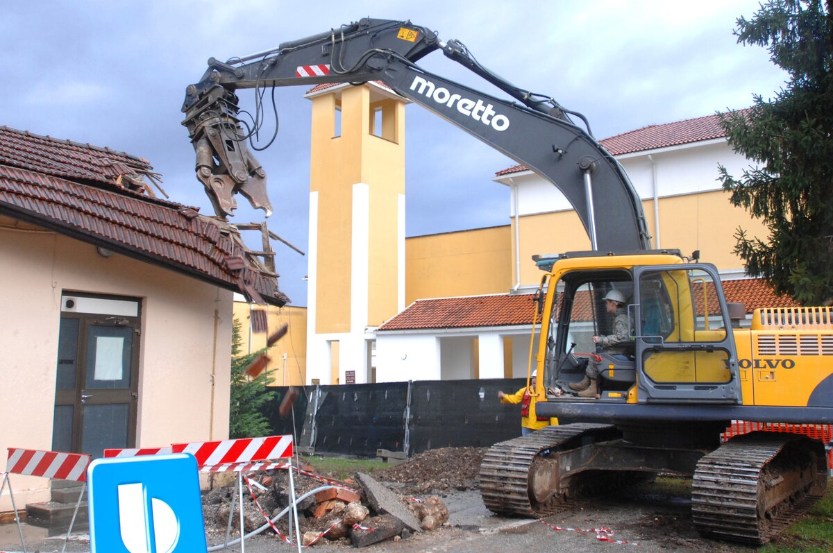 Airman 1st Class Ashley Forester, from the 31st Medical Group, operates an excavator to demolish a building December 16, 2008, on Aviano Air Base, Italy. The demolition of this building is part of the plan to reduce the energy and footprint of Aviano Air Base has by 20 percent by year 2020. (U.S. Air Force photo/ Staff Sgt. Patrick Dixon)