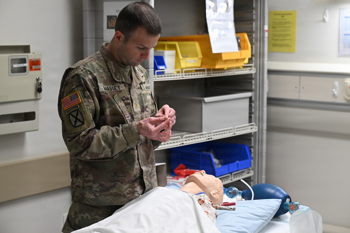 From left, U.S. Air Force Capts. Michelle Aholia, Nicole Chalut, and Anne Gielyn, 31st Operational Medical Readiness Squadron clinical nurses, receive instructions from Lt. Col. Kara Granroth, Landstuhl Regional Medical Center advanced trauma life support instructor, during a simulated trauma medical exercise at Aviano Air Base, Italy, Jan. 29, 2026. The joint training standardized U.S. European Command medical procedures and practices across multiple services and locations. (U.S. Air Force photo by Airman 1st Class Stephan Bang)