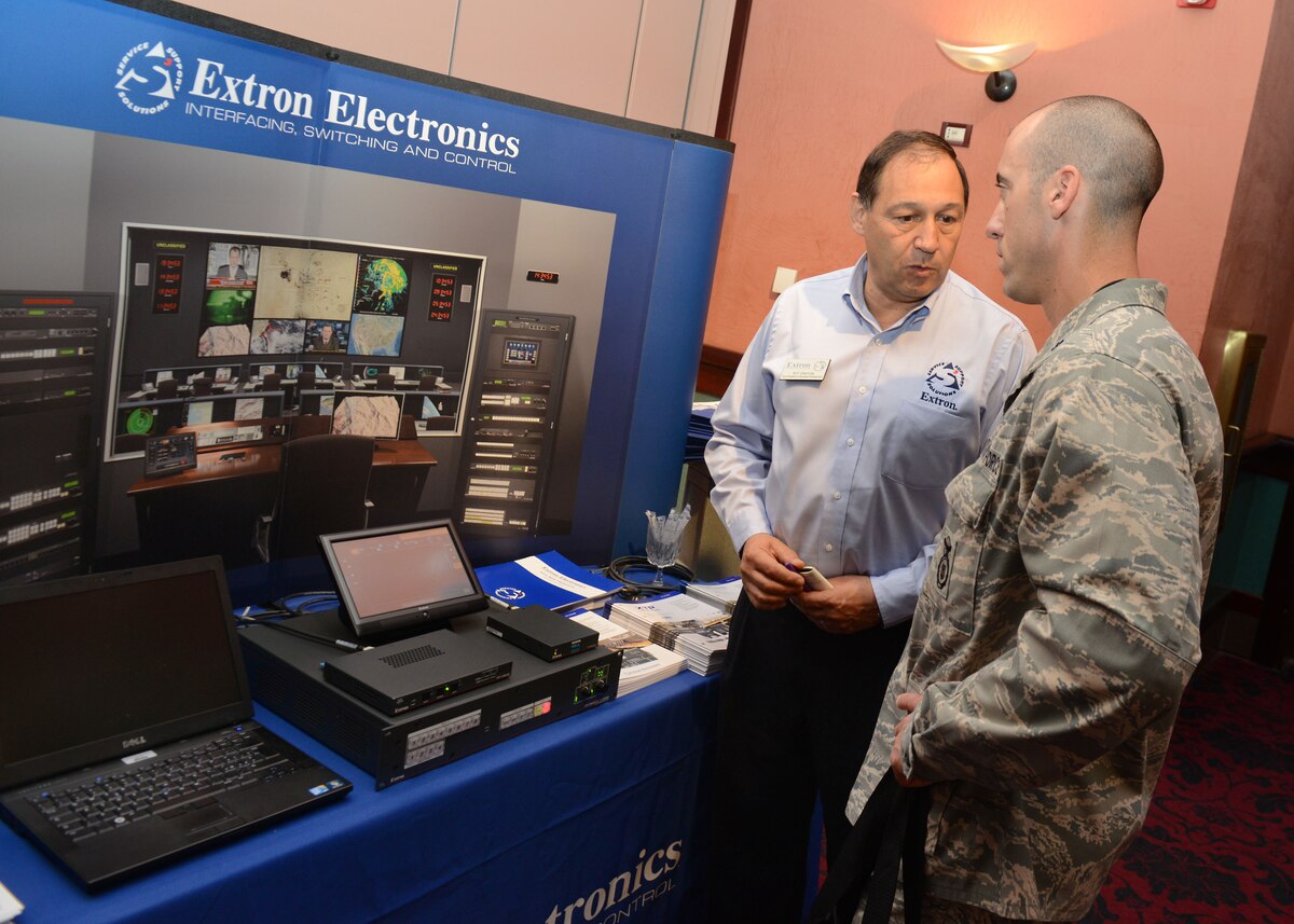 Karlheinz Korz, technology expo representative, speaks to Lt. Col. Rosalie Duarte, 31st Force Support Squadron commander, about telecommunication and cable television services during a technology expo, Sept. 25, 2014, at Aviano Air Base, Italy. Approximately 17 vendors were on hand to answer questions, demonstrate emerging technologies and network with attendees. (U.S. Air Force photo/Airman 1st Class Ryan Conroy)