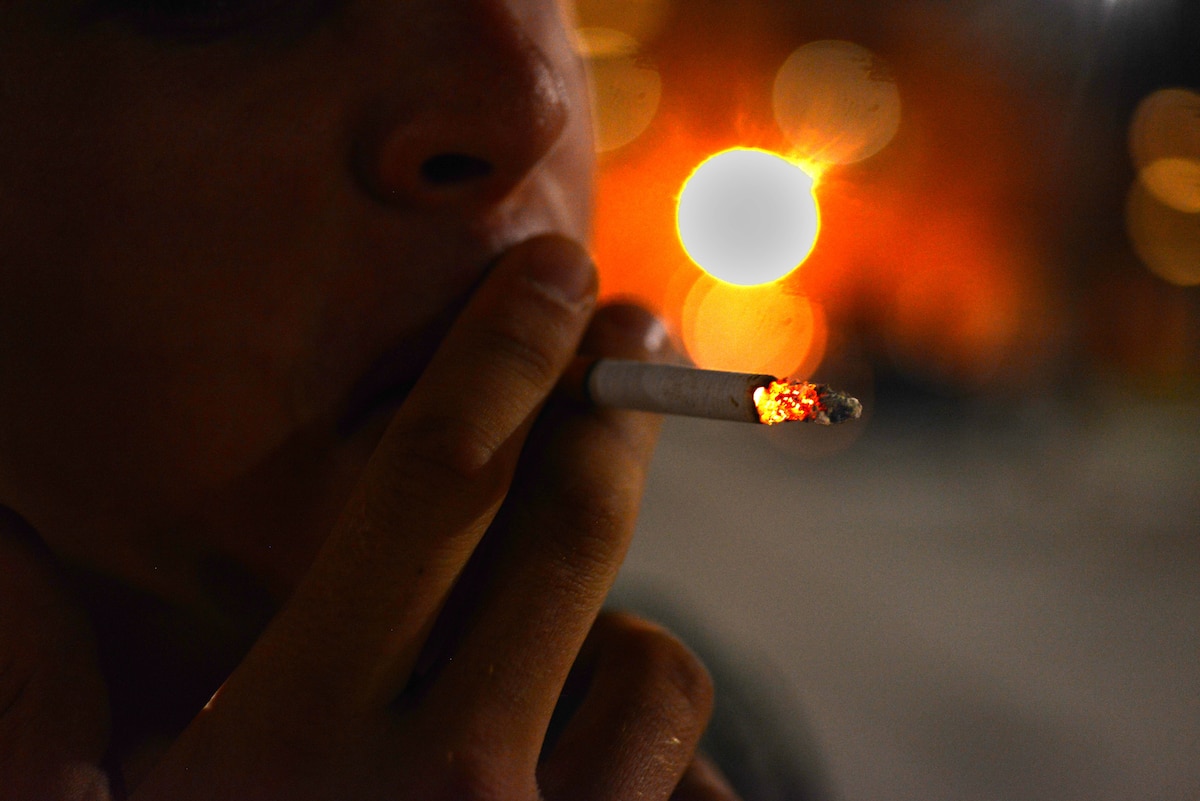 An Airman smokes a cigarette, August 20, 2013 at Aviano Air Base, Italy. According to a surgeon general report, within the first month of quitting smoking, carbon dioxide levels in the blood drop to normal, circulation and lung function improve, and cilia (tiny hair-like structures that move mucus out of the lungs) starts to regain normal function in the lungs, increasing the ability to handle mucus, clean the lungs, and reduce the risk of infection. (U.S. Air Force photo/Airman Ryan Conroy)
