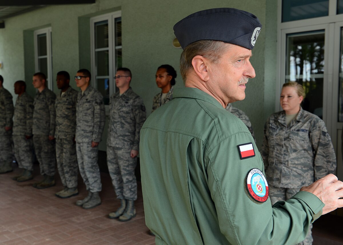 LASK AIR BASE, Poland -- U.S. Air Force Maj. Matthew Spears, commander of Detachment 1, 52nd Operations Group, talks with Polish air force commander Lt. Gen. Lech Majewski and Col. Krystian Ziec, 32nd Tactical Air Base commander, discuss future partnership-building events July 17, 2013. Spears' aviation detachment is a training hub for all inbound U.S. aircraft into Poland, and the unit has organized four aircraft rotations a year. Aviano Air Base, Italy, supplied the Airmen for this rotation — the third since the aviation detachment's creation in 2012. (U.S. Air Force photo by Staff Sgt. Daryl Knee)